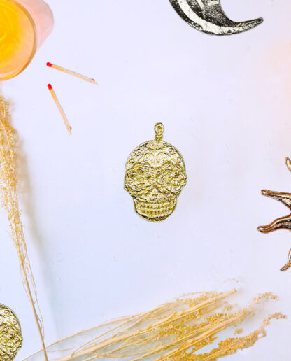 Milagro mexicain en métal zamak doré en forme de crâne, décoré avec motifs floraux finement gravés sur toute la surface.