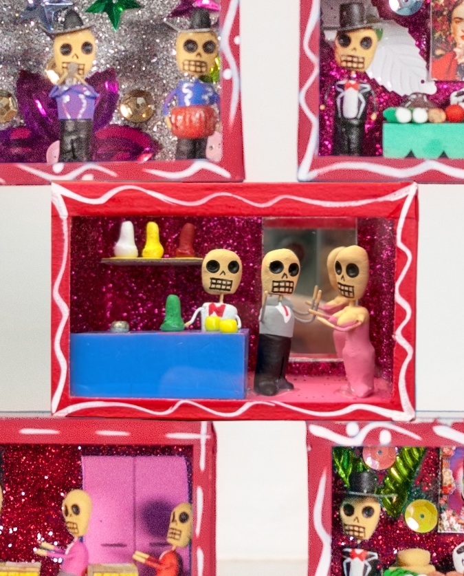 Découvrez cette authentique saynète mexicaine : une boîte de couleur rouge vibrant présentant des calacas (squelettes) en situation de vie quotidienne au bar. Chaque figurine est peinte à la main avec soin, mettant en valeur les costumes colorés et les expressions typiques de la culture mexicaine.