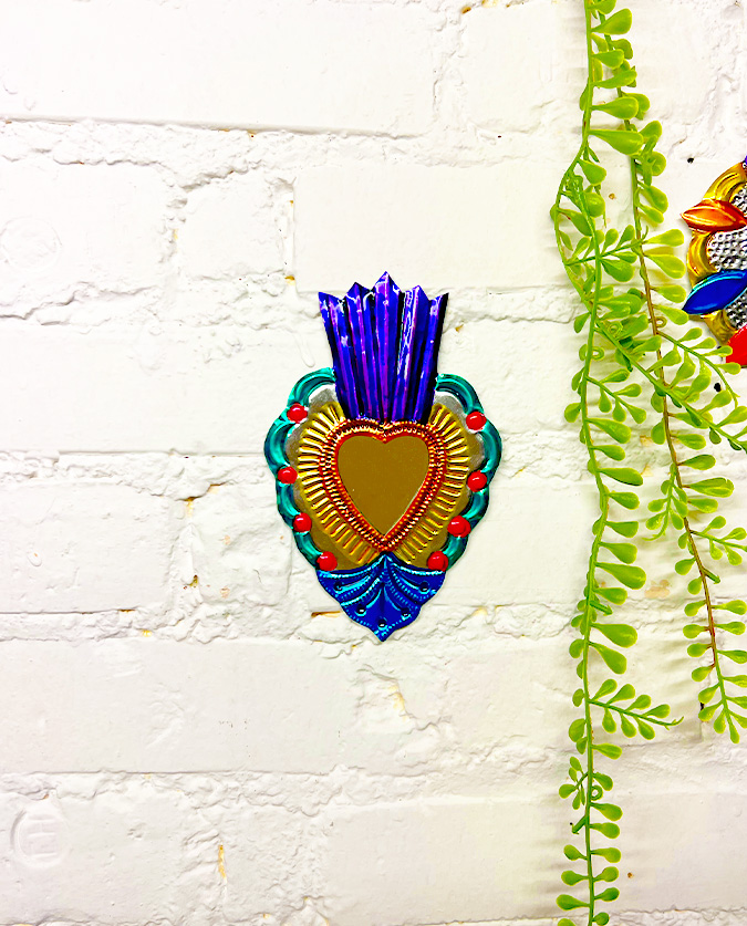 Typique de l’artisanat populaire mexicain l’ex-voto mexicain ou milagro mexicain en métal repoussé est donc la représentation du coeur sacré de Jésus ou du coeur sacré de Marie.