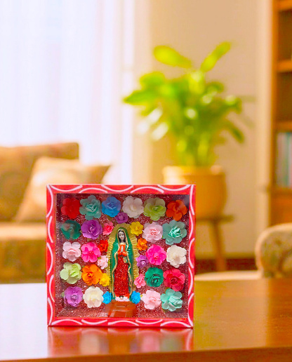 Wooden display case with a resin Virgin of Guadalupe surrounded by flowers, entirely handmade in Mexico. Red color